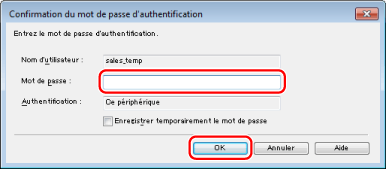 Dans cet exemple, la boîte de dialogue [Confirmation du mot de passe d'authentification] s'affiche, car l'option [Enregistrer le mot de passe et passer la boîte de dialogue d'authentification lors de l'impression] n'a pas été sélectionnée lors de la définition du compte utilisateur dans l'extension AMS Fonctions additionnelles.