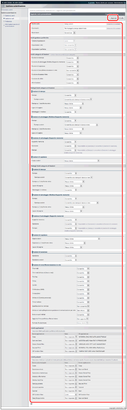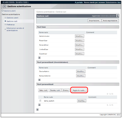 È possibile registrare un massimo di 100 ruoli tra ruoli base e ruoli personalizzati (amministratore).