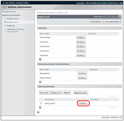 Per cambiare l'impostazione [Ruolo base] (e quindi cambiare i privilegi di gestione della periferica), è necessario eliminare il ruolo e registrarlo nuovamente (è possibile anche esportare il ruolo e modificare l'impostazione [Ruolo base] all'interno di un editor di testo, ma in questo caso è necessario fare attenzione a non modificare i caratteri di controllo).
