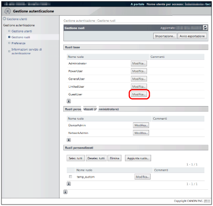 Dopo aver modificato il ruolo [GuestUser], si consiglia di effettuare un backup delle informazioni dei ruoli esportandole. Per ulteriori informazioni, vedere "Esportazione dei ruoli".