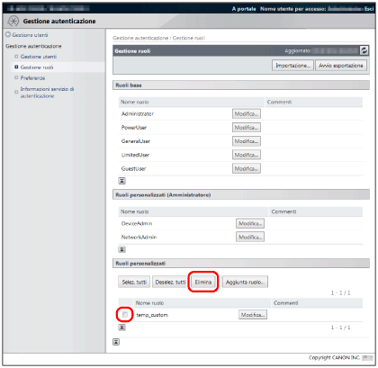 I ruoli base e i ruoli personalizzati (amministratore) non possono essere eliminati.