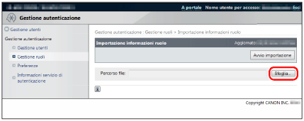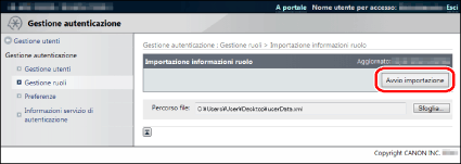 Se nella periferica sono stati registrati ruoli non inclusi nel file importato, questi ruoli non vengono eliminati e alla periferica vengono aggiunti i ruoli presenti nel file importato.