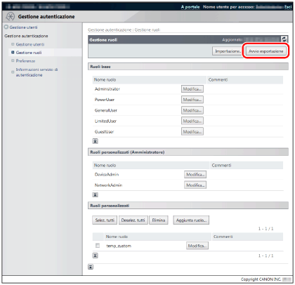 Dopo avere creato ruoli personalizzati, si consiglia di eseguire il backup delle informazioni dei ruoli esportandole. Poiché i ruoli esportati possono essere importati in altre periferiche, è possibile registrare anche in più periferiche i ruoli personalizzati creati. Per ulteriori informazioni, vedere "Importazione dei ruoli" e "Esportazione dei ruoli".