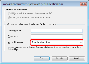Se si seleziona [Salva password e ignora finestra di dialogo di autenticazione durante la stampa], è possibile stampare senza immettere alcuna password. Tuttavia, si consiglia di impostare l'immissione della password a ogni stampa per una maggiore sicurezza. [Salva password e ignora finestra di dialogo di autenticazione durante la stampa] viene abilitato selezionando [Salvare informazioni di autenticazione utente] in [Gestione driver stampante] quando vengono specificate le preferenze delle periferiche. Per ulteriori informazioni, consultare "Specifica delle preferenze delle periferiche".