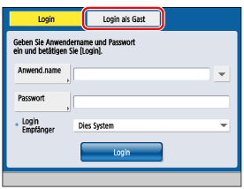 Wenn Sie [Login nicht gespeicherter Anwender als Gastanwender zulassen] auswählen und "Anmeldung auf Geräteebene" als Anmeldemethode ausgewählt ist, wird ein Anmeldebildschirm ähnlich wie der Folgende auf dem Sensordisplay des Geräts angezeigt. Unregistrierte Benutzer melden sich durch Berühren von [Login (Gast)] ohne Eingabe eines Benutzernamens oder Passworts an. Die Funktionen, die unregistrierte Benutzer verwenden können, werden in den Nutzungsbeschränkungsdaten der Rolle [GuestUser] festgelegt.
