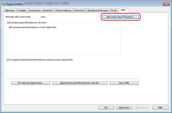 Wenn die im Gerät registrierten Druckeinschränkungsdaten (Benutzerdaten und Rollendaten) geändert werden, klicken Sie auf der Seite [AMS] auf [Beschränkungsinformationen abrufen], um die neuesten Druckeinschränkungsdaten zu laden. Wenn sich die im Gerät registrierten Druckeinschränkungsdaten und die Druckeinschränkungsdaten im AMS Printer Driver Add-in unterscheiden, tritt ein Fehler auf. Beachten Sie, dass manche Dokumente nur einmal gedruckt werden dürfen und ein erneuter Ausdruck in diesem Fall nicht mehr möglich ist.