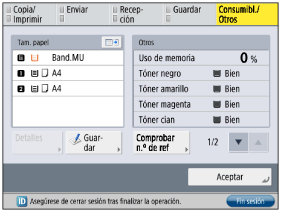 (Monitor estado/Cancelar) en la pantalla táctil del dispositivo. Cuando se utiliza Access Management System, se puede comprobar el estado del dispositivo en la pantalla [Monitor estado/Cancelar] sin iniciar sesión en el dispositivo, pero no se puede comprobar el estado de copia y envío/recepción.|