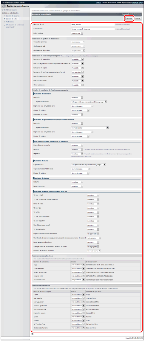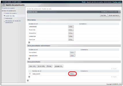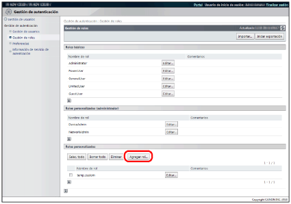 Para cambiar la configuración de [Roles básicos] (y, por lo tanto, cambiar los privilegios de administración del dispositivo), es necesario eliminar el rol y volver a registrarlo. (También es posible exportar el rol y cambiar la configuración de [Roles básicos] editándola con un editor de texto. Sin embargo, procure no editar los caracteres de control en este caso.)