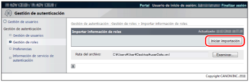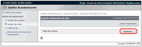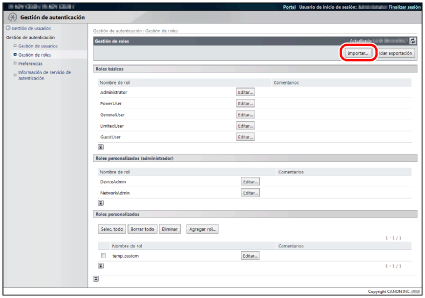 Si los roles no incluidos en el archivo de importación estaban registrados en el dispositivo, no se eliminarán, y los roles en el archivo de importación se añadirán al dispositivo.