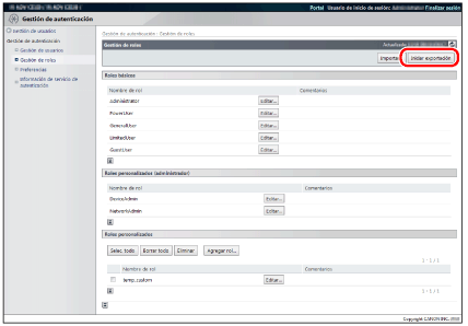 Se recomienda exportar la información de roles después de crear roles personalizados con fines de copia de seguridad. Puesto que los roles exportados pueden importarse en otros dispositivos, los roles personalizados que cree también podrán registrarse en varios dispositivos. Para obtener más información, consulte "Importación de roles" y "Exportación de roles".