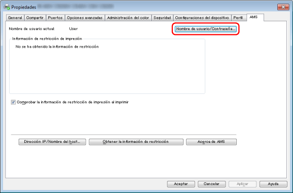 Si se modifica la información de restricciones de impresión , haga clic en [Obtener la información de restricción] en la página [AMS] para recuperar la información de restricciones de impresión más reciente. Si la información de restricciones de impresión registrada en el dispositivo y la información de restricciones de impresión en AMS Printer Driver Add-in difieren, se producirá un error. Tenga cuidado, ya que no se podrán imprimir los documentos para los que solo se permite una impresión.
