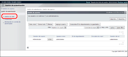 Asocie roles a usuarios en la pantalla [Gestión de usuarios]. Para obtener más información, consulte los manuales de instrucciones del dispositivo.