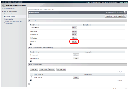 Se recomienda exportar la información de roles después de editar el rol [GuestUser] con fines de copia de seguridad. Para obtener más información, consulte "Exportación de roles".