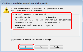 En este ejemplo, se abre el cuadro de diálogo [Confirmación de las restricciones de impresión] porque se seleccionó [Comprobar la información de restricción de impresión al imprimir] cuando se estableció la información de usuario en el AMS Printer Driver Add-in.