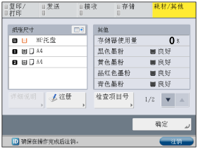 (状态确认/取消)时显示[状态确认/取消]屏幕。操作Access Management System时,无需登录设备即可在[状态确认/取消]屏幕上检查设备状态,但是无法检查复制和发送/接收状态。|