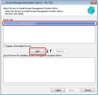 从[Driver List]中选择要安装AMS Printer Driver Add-in的驱动程序 → 单击[Add]。