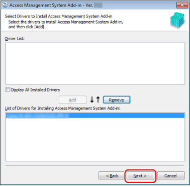 确认[List of Drivers for Installing Access Management System Add-in]中显示恰当的驱动程序名称 → 点击 [Next]。