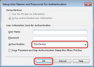 确认[Authentication]中选择了[This Device]→在 [User Name] 和 [Password] 中输入[sales_temp]的用户名和密码 → 单击[OK]。