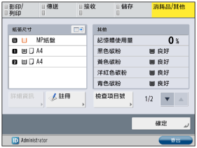 (狀態確認/取消) 時,會顯示 [狀態確認/取消] 畫面。操作 Access Management System 時,裝置狀態可以在 [狀態確認/取消] 畫面上直接查看,而無須登入裝置,但無法查看影印及傳送/接收狀態。|