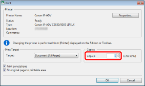 The [Print] dialog box is displayed if the [Display print/send fax dialog] check box is selected. In this case, proceed to step 4.