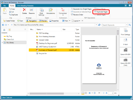 If multiple pages were selected with the thumbnail view, the duplicated PDF document is saved with "_page number of first page selected" appended to the document name.
