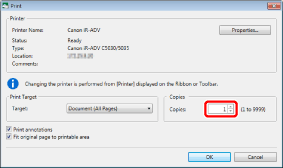 for (Print) on the ribbon or However, if the [Display print/send fax dialog] check box is deselected, a confirmation message is displayed if you perform an operation when annotations are hidden. To print the annotations, click [Print with annotations].