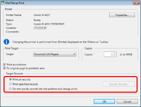 When printing a document with Mail Merge fields set, [Print] automatically switches to [Mail Merge Print]. To execute Mail Merge printing, perform one of the following operations.