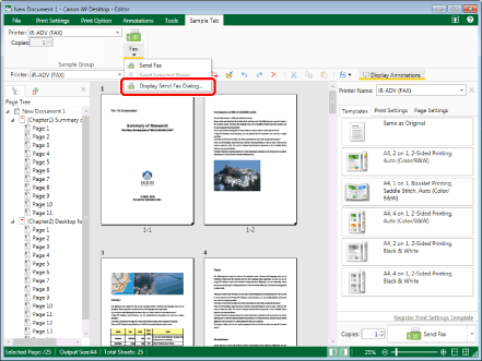 If the [Display print/send fax dialog] check box is selected, the [Send Fax] dialog box is displayed. For more information on using the [Send Fax] dialog box to send documents via fax, see the following.