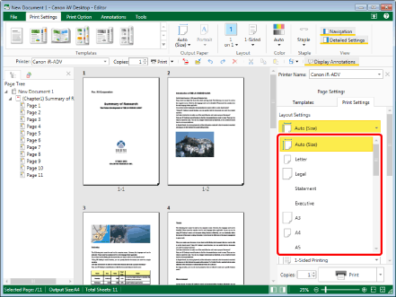 If you set the output paper size to something other than [Auto (Size)] for a document including different page orientations or sizes, pages of which the orientation/size is different from the orientation/size of the current paper are automatically enlarged or reduced to fit the paper width (they are not automatically rotated).