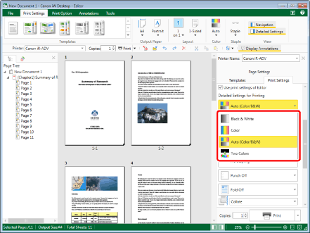 If you deselect the [Apply the color setting to preview] check box on the [Print Settings] tab on the Details Window, the ribbon command, or the tool button, the preview is displayed in color even if you set the color mode to [Black & White].