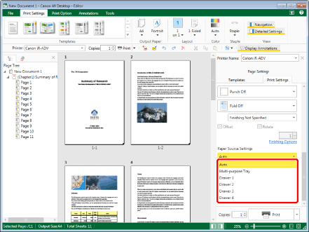 The settings that can be selected for the paper source of the document text differ according to the type of paper sources in the printer selected in [Printer].
