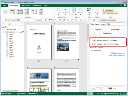 Select the [Insert Header/Footer into Print Pages] check box in [Header/Footer Settings] on the [Page Settings] tab on the Details Window.