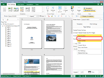 Or, select [None] from the pull-down list of each [Header]/[Footer] in the [Print Pages]/[Original Pages] groups on the ribbon.
