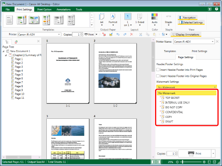 Select the watermark to set from the pull-down list on the [Page Settings] tab on the Details Window.