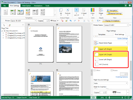 Select the staple position in [Detailed Settings for Printing] on the [Print Settings] tab on the Details Window.