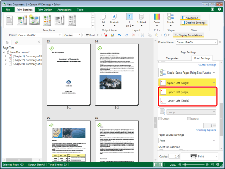 Select [Staple Same Pages Using Eco Function] in [Detailed Settings for Printing] on the [Print Settings] tab on the Details Window.