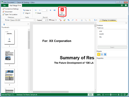 When opening an IWB document in which information for connecting to a database is stored, starting the Mail Merge Print Settings Mode causes the database to be automatically connected to and the Mail Merge data to be updated.