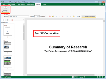 If the [Display print/send fax dialog] check box is deselected in [System Settings], a confirmation message is displayed if you perform one of the following operations when annotations are hidden. To print annotations, click [Print with annotations].