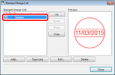 You can display the stamped image list that is registered in Desktop Editor. You can also switch between showing/hiding the registered stamped images.