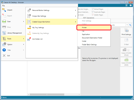 Select the [File] menu > [Tools] > [Create Output Bar Button] > [Printer].