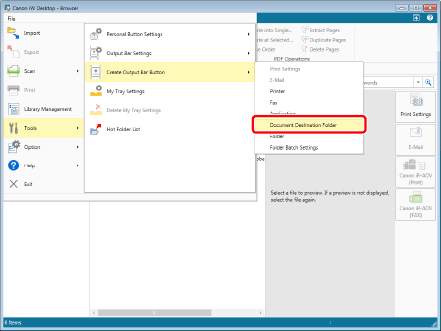 Select the [File] menu > [Tools] > [Create Output Bar Button] > [Document Destination Folder].