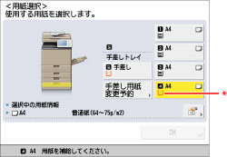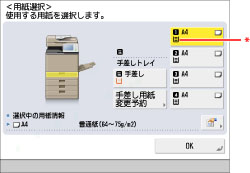 それぞれの給紙箇所を用紙カセット自動選択の対象にするかどうかを、機能ごとに設定できます。工場出荷時は、手差しトレイが「OFF」に、他はすべて「ON」に設定されています。(→機能ごとに給紙箇所を自動で選択する)