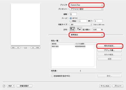 お使いのファクス→[基本設定]を選択→[宛先の追加]をクリック