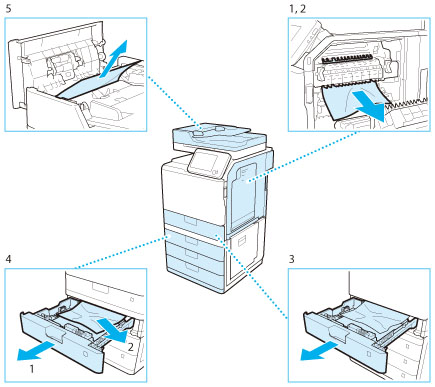 製品内部で紙づまりが起きる場所と、紙づまり処理については、次を参照してください。