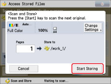 If the following screen is displayed, after the last batch of originals is scanned, press [Start Storing].