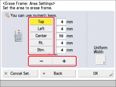 Press [Center] and [Sides] → press [-] or [+] to set their respective Erase Frame widths.