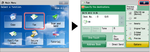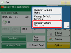 Four options shortcuts are displayed on the Fax Basic Features Screen. [Density], [Original Type], [2-Sided Original], and [Preview] are displayed as default. These shortcuts can be changed to functions that you frequently use.