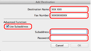 Enter the name and fax number of the destination in [Destination Name] and [Fax Number] → select [Use Subaddress] → enter a subaddress and password for the memory box of the destination's fax.