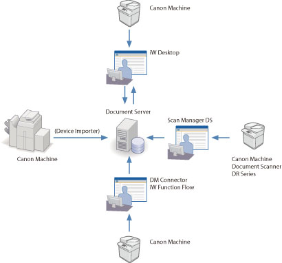 Documents imported with iW Scan Manager DS can be released to "Document Server," which is the core iW series software product utilised in various business situations.