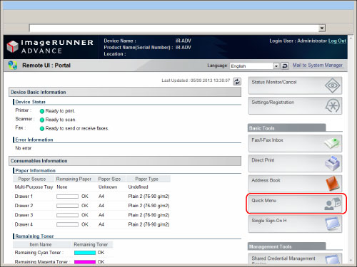 Only the System Manager, or SSO-H System Administrator (Administrator)/Network Administrator (NetworkAdmin)/Device Administrator (DeviceAdmin) can operate the Quick Menu Page. For information on the types of administrators, see "Administrator Settings."